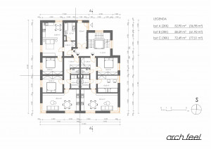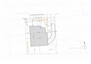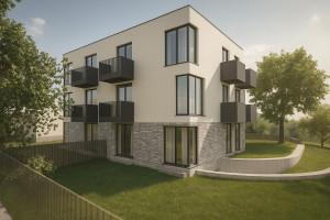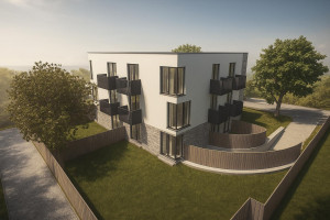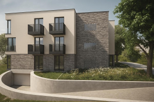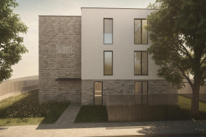 Studie novostavby bytového domu s 9 bytovými jednotkami a technickým suterénem. Kubická hmota je členěna hmotou vstupu a schodiště, která je stejně jako první nadzemní podlaží obložena cihelným páskovým obkladem.